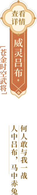 对敌方前排造成超巨量苍御伤害。根据【花灵】血量,百分比增加自身同排武将造成的苍御伤害。 威灵吕布获得苍御伤害增加效果翻倍。 自身获得若干战团值。